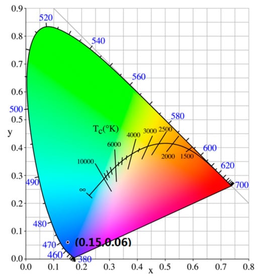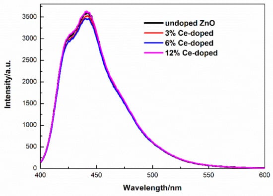 The PL emission spectra of un-and different Ce-doped ZnO film under 375 nm excitation are shown in Figure 7. All films have emission peaks at about 424 and 442 nm. An emission of 424 nm is assigned to the recombination of the Zn interstitial levels to the top of the valence band; 442 nm emission is attributed to the recombination of O vacancies to the valence band [32]. CIE-1931 chromaticity coordinates of samples is (0.1518, 0.0594), (0.1517, 0.0602), (0.1518, 0.0603), (0.1519, 0.0598) for undoped and 3%, 6%, 12% Ce-doped ZnO, respectively (Figure 8). The color purity was calculated using [40]