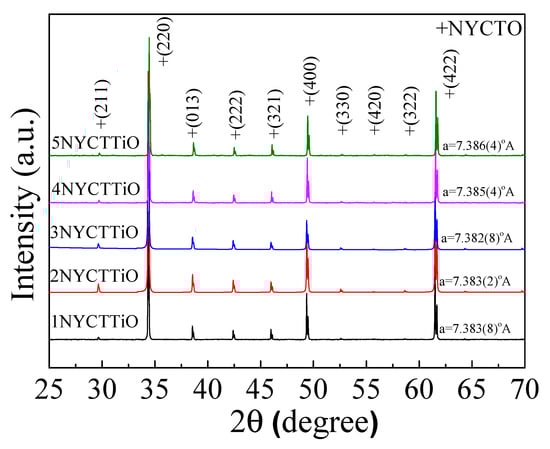 ACu3Ti4O12 is a dielectric material group that has received extensive attention because of its interesting dielectric properties. CaCu3Ti4O12 (CCTO) [4,5], CdCu3Ti4O12 (CdCTO) [18,19], Na1/2Sm1/2Cu3Ti4O12 (NSmCTO) [20], Na1/2Y1/2Cu3Ti4O12 (NYCTO) [16,21,22,23], Na1/2La1/2Cu3Ti4O12 (NLCTO) [24,25], Y2/3Cu3Ti4O12 (YCTO) [26,27], La2/3Cu3Ti4O12 (LCTO) [28], Bi2/3Cu3Ti4O12 (BCTO) [29,30,31,32], and Na1/2Bi1/2Cu3Ti4O12 (NBCTO) [17,33,34] were dielectric materials in the ACu3Ti4O12 oxides group. These materials have perovskite structures and often have reported excellent dielectric properties. However, these materials still have limitations under many conditions for application in electronic devices. The dielectric properties of CCTO and NYCTO ceramics can be significantly improved by the addition of excess TiO2 [9,21].