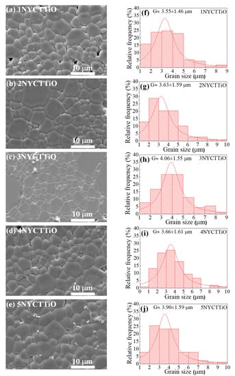 Figure 2a–e show the morphologies of Na1/2Y1/2Cu3Ti4.1O12 ceramics sintered under different conditions using the SEM technique. The SEM images clearly show the grains and GBs. A small number of pores can be observed. The grain-size distributions are shown in Figure 2f–j. The mean grain sizes of the 1NYCTTiO, 2NYCTTiO, 3NYCTTiO, 4NYCTTiO, and 5NYCTTiO samples were 3.55 ± 1.46, 3.63 ± 1.59, 4.06 ± 1.55, 3.66 ± 1.61, and 3.90 ± 1.59 μm, respectively. The average grain size increased slightly with increasing temperature and time in the sintering process, which may have been caused by the enhanced diffusion of ions [6,7]. The densities of the samples were 96.34, 97.40, 97.67, 95.61, and 96.90%, respectively.