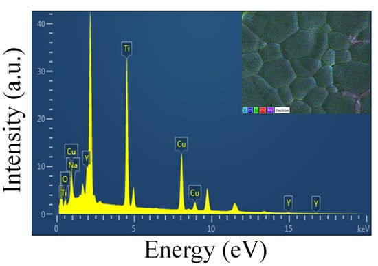 The elemental composition of the Na1/2Y1/2Cu3Ti4.1O12 ceramic sintered at 1070 °C for 15 h was studied using EDS. The EDS spectrum shown in Figure 3 can be used to observe the major elements consisting of Na, Y, Cu, Ti, and O peaks to confirm the elemental composition of the ceramics. The mapping technique was used to study the elemental distribution, as shown in Figure 4a,b. All elements were homogeneously dispersed inside the grains. Figure 4a shows the distribution of elements; all elements were well-distributed throughout the sample. However, segregation of Cu was observed around the GB to detect CuO, which may have been caused by the effect of sintering temperature and increasing Ti concentration. The concentration of excess Ti may enter into the Cu sites in the structure, causing the segregation of CuO at the GB during the temperature sintering process [9,10,11]. Moreover, when examining the distribution of elements at the GB in the area without CuO, Ti element was detected at the GB, indicating that excess Ti tends to unite at the GB, as shown in Figure 4b. Generally, TiO2 and CuO have electrical insulating properties; detecting this at the GB may result in an increase in resistance at the GB, which is an important factor for reducing tan δ in perovskite dielectric materials [10].