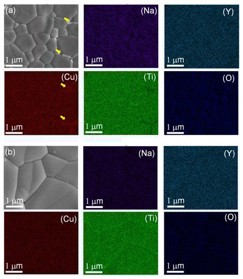 SEM mapping images of Na, Y, Cu, Ti, and O considering the amount of Cu (a) and Ti (b) at the grain boundary of the Na1/2Y1/2Cu3Ti4.1O12 ceramic sintered at 1070 °C for 15 h.