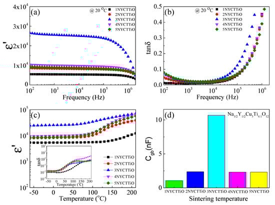 Figure 5c shows the dependence of ε′ and tan δ on the temperature. The ε′ and tan δ values of the 2NYCTTiO, 4NYCTTiO, and 5NYCTTiO samples were greatly increased when the temperature was above 90 °C. These dielectric responses were caused by the electric charge having high energy (maybe more than the potential energy at the GB) and being easier to move at a high temperature. As a result, the polarization process occurs more easily and the electrical conductivity increases [19,20,21,22]. However, the ε′ values of the 1NYCTTiO and 3NYCTTiO samples were relatively stable with temperature, indicating that the sintering condition for ε′ stability with temperature was successfully achieved. As shown in Figure 5d, the GB capacitance (Cgb) values were calculated in the temperature range of 150–200 °C using the electric modulus (M*) technique. The Cgb values of the 1NYCTTiO, 2NYCTTiO, 3NYCTTiO, 4NYCTTiO, 5NYCTTiO samples were 1.07, 2.38, 10.7, 2.32, and 2.32 nF, respectively. The Cgb values did not change with increasing sintering temperatures due to the small change in the sintering temperature. However, Cgb tended to increase with increasing sintering duration, which corresponds to an increase in ε′. This may be the major factor causing the ε′ rise when using the IBLC model [6]. In this study, excellent dielectric properties were obtained for the 3NYCTTiO samples.