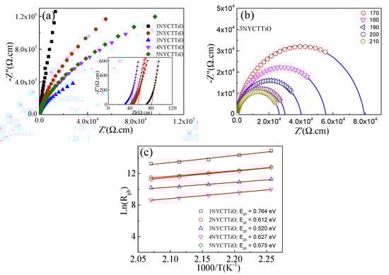 where α is a constant (). The Rgb values were obtained by fitting the experimental data of Z* in the temperature range of 170–210 °C. Figure 6b shows the fitted results of Z* plots for the 3NYCTTiO sample for calculating the Egb value. The other samples were fitted using the same process (data not shown). Next, the Egb values were calculated using the Arrhenius law: