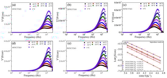 Admittance imaginary (Y″) as a function of the frequency plot in the temperature range of −60–0 °C for Na1/2Y1/2Cu3Ti4.1O12 ceramics sintered at (a) 1070 °C for 1 h, (b) 1070 °C for 5 h, (c) 1070 °C for 15 h, (d) 1080 °C for 5 h, and (e) 1090 °C for 5 h. (f) Arrhenius plot of grain conductivity (σg).