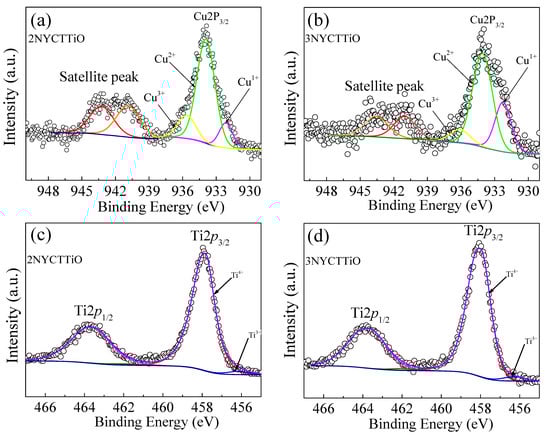 Normally, the grains of ACu3Ti4O12 ceramics are semiconducting. Thus, studying the electrical properties of grains plays an important role in changing the dielectric properties of ceramic materials. The oxidation states of the Ti and Cu ions in the grains were investigated using XPS. Figure 8a–d show the electron hopping between Cu+ Cu2+, Cu2+ Cu3+, and Ti3+ Ti4+ in the 2NYCTTiO and 3NYCTTiO samples. The peaks of Cu2p3/2 were fitted using Gaussian–Lorentzian models, as shown in Figure 8a,b, and the peaks of Cu+, Cu2+, and Cu3+ were observed at the mean binding energies of approximately ≈932.13–932.25, 933.92–934.09, and 935.63–936.10 eV, respectively. The calculated Cu+/Cu2+ of the 2NYCTTiO and 3NYCTTiO samples were 18.34% and 45.62%. The Cu+/Cu2+ ratio tends to increase with increasing sintering durations. Two peaks of Ti 2p3/2 are shown in Figure 8c,d. The Ti3+/Ti4+ ratios were 3.33% and 3.18%, which almost did not change with increasing sintering durations, indicating that the effect of sintering was not affected by electron hopping between Ti3+ Ti4+. Thus, the electrical properties of the grains may result from electron hopping between Cu+ Cu2+. Generally, the electrical conductivity depends on the concentration of free charges and the mobility of the charge carriers in the material. ACu3Ti4O12 ceramics often lose oxygen during sintering, resulting in oxygen vacancies and free electrons [28,29]. Accordingly, increasing the Cu+/Cu2+ ratio indicates an increase in the electrical conductivity of the grains. The increasing electrical conductivity within the grains was related to a decrease in Rg, which may be the major cause of the ε′ increase, which can be described based on the IBLC model [30].