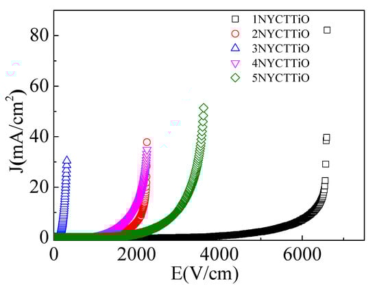 The non-ohmic characteristics of ACu3Ti4O12 ceramics have been extensively studied to explain their electrical behavior in the Rgb of materials. The effect of sintering duration on the nonlinear current density–electric field (J–E) characteristics of the Na1/2Y1/2Cu3Ti4.1O12 ceramics is shown in Figure 9. The Eb and the nonlinear coefficient (α) can be calculated. Both values can be calculated using the equation of varistor characteristics (I = KVα), where K is the constant related to the resistance of the material. The α values were calculated in the current density (J) range of 1–10 mA, and the Eb values were obtained at J = 1 mA. The α and Eb values of the 1NYCTTiO, 2NYCTTiO, 3NYCTTiO, 4NYCTTiO, and 5NYCTTiO samples were 6.1, 5.7, 4.1, 4.2, and 4.7 and 4251.5, 1426.50, 138.2, 1101.2, and 1825.4 V/cm, respectively. The Eb and α values tended to decrease with increasing temperature durations, which is similar to the electrical behavior of NYCTO ceramics [2,6]. Both values support Rgb and Egb, which decreased with increasing temperatures. With respect to the sintering temperature effect, Eb was slightly decreased in the 4NYCTTiO sample (sintered at 1080 °C for 5 h) but increased in the 5NYCTTiO sample (sintered at 1090 °C for 5 h) when compared with the 2NYCTTiO sample (sintered at 1070 °C for 5 h). In the 4NYCTTiO sample, the slight decrease in the Eb values may have been caused by the enhancement in the oxygen vacancy concentration at the i-GBs in the sintering temperature mechanism. However, the increased Eb values in the 5NYCTTiO sample may have been caused by an increase in the CuO content at the GB in the high-temperature sintering process.