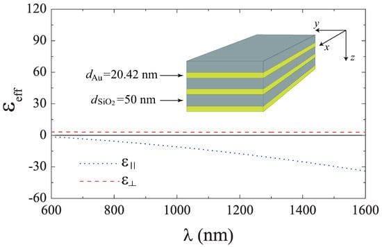 with for the filling fraction of metal inclusions; and are the thicknesses of the metallic and dielectric layers, respectively. It is worth mentioning that this last effective medium approach is only valid under the condition .
