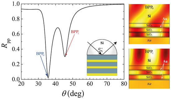 Numerical reflectance as a function of the angle of incidence. The reflectance dips labeled with BPP () and BPP () indicate the two BPP modes that are excited in the multilayer structure. The corresponding magnetic field profiles are shown in the top and bottom right side panels. The finite multilayer structure, consisting of a Si-prism and a tri-bilayer system, is depicted in the inset.