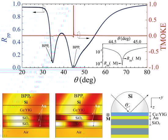 The finite element method (FEM), using the commercial software COMSOL Multiphysics, and the SMM, were used for full electromagnetic simulations of the system in Figure 3. the numerical results are presented for the TMOKE and , with an inset showing the differences in and due to changes in the ATR-SPR matching-condition (induced by MO activity). In these calculations, we replace the first slab from Figure 2, made of SiO, by a MO slab of Ce−YIG with thickness nm. The TMOKE for this system associated to the resonance BPP has an amplitude of 0.977, as seen from the vertical scale on the right-hand side in Figure 3. In contrast, the TMOKE associated with BPP exhibits negligible behavior (see Figure 4c), which can be understood in two different, yet complementary, ways: (i) numerically, the higher reflectance value associated with BPP produces a very low TMOKE amplitude, as numerically studied in [17]; (ii) physically, the near-zero reflectance associated with BPP indicates a near-perfect incident light-HMM coupling, which, in turn, enhances the MO activity of the nanostructure [17]. We can observe a higher near-field amplitude inside the MO slab when comparing the field profiles shown in the lower panel of Figure 3.