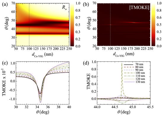 (a) Reflectance for (i.e., the demagnetized system) and (b) as functions of the incident angle () and the MO layer thickness (). TMOKE associated with the (c) BPP () and (d) BPP () resonances for different values. All the calculations in this figure were performed using nm and nm.