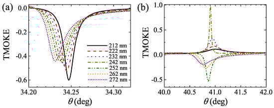 Numerical analysis of TMOKE associated with the (a) BPP and (b) BPP resonances from the vertical dotted line B in Figure 5.