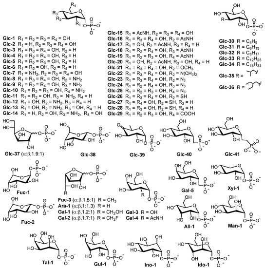 RmlA is a nucleotidyltransferase that catalyzes the first reaction to form dTDP-glucose (dTDP-Glc) by transferring a deoxythymidine triphosphate (dTTP) to glucose-1-phosphate (Glc-1-P) via a single sequential displacement mechanism [24]. Based on the reverse reaction, RmlA is also known to be a pyrophosphorylase [24]. RmlA has attracted more attention because it displays unusual promiscuity toward both sugar-1-phosphates and nucleotide triphosphate substrates, which could be harnessed in glycorandomization [25,26]. The inherent sugar-1-phosphate and/or nucleotide triphosphate (NTP) promiscuity of RmlA was further expanded by mutation studies. For example, L89T [27], E162D, Y177F [27], T201A, and W224H [28] mutants increased its sugar-1-phosphate tolerance and conversion [27], whereas Q24S [29] and Q83D/S [30] mutants altered the preference for the NTP of wildtype RmlA (also called the inherent NTP purine/pyrimidine bias). RmlA and its variants can utilize 57 sugar-1-phosphates ranging from all epimers [26], substituted compounds (amino [30], N-acetyl [31], methyl [32], azido [32], thiol [32], and alkyl [33]), deoxy sugars of D-glucose [32], two anomers of L-fucose [34], to pentofuranosyl-1-phosphate [34]. In addition to sugar-1-phosphate substrates, Moretti et al. reported that RmlA could recognize all eight natural NTPs as substrates despite its reduced activity toward purine NTPs [35]. Furthermore, Cps2L (a RmlA homolog) can act on deoxythymidine 5-tetraphosphate (p4dT) and Glc-1-P to form dTDP-Glc and triphosphate (PPPi) [32]. To date, 154 (d) nucleotide diphosphate (NDP)-sugars have been produced by RmlA and its variants (Figure 2 and Supplementary information Table S1) [36,37,38,39,40,41,42].