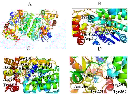 The 3-hydroxyl group of ribose contacts Q24 (Figure 3B) [45], and glucose residue interacts with RmlA via hydrogen bonds. Specifically, O2 and O3 of glucose form hydrogen bonds with E161; O2, O3, and O4 of glucose form hydrogen bonds with G146 and L172; O6 of glucose forms hydrogen bonds with N111 (Figure 3C). In addition, Q26, G11, S13, and two water molecules bind magnesium. Therefore, the crystal structures of RmlA helped to reveal the reaction mechanism and provide a basis for active site engineering of RmlA [35].