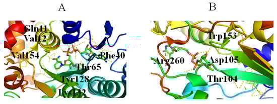 RmlD catalyzes the last step in the dTDP-Rha biosynthetic pathway, in which the C4 keto group of dTDP-4-keto-Rha is reduced to a hydroxyl group to produce dTDP-Rha (Figure 1) [52,53]. During the reaction, proton transferred from the nicotinamide ring of the cofactor to the C4 keto group requires the assistance of Mg2+ [52]. RmlD is a homodimer, and the monomer consists of two domains: an N-terminal domain that binds NAD(H), and a C-terminal domain that binds substrate [52]. Various residues are involved in interactions with NAD(P)H, including (1) a ribose moiety located in the space formed by Ala62, Ala63, Gly7 and Gly10, in which the 2′- and 3′-hydroxyl groups of the ribose ring and Lys132 from the conserved YXXXK motif engage in two hydrogen bonds (Figure 6A); (2) the adenine ring of the cofactor located in a pocket formed by Val31, Asp39, Phe40, Ala62, Ala63, Leu80, and Phe40, in which Asp39 interacts with adenine via hydrogen bonds (Figure 6A); (3) Gln11 and Thr 65 interact with diphosphate (Figure 6A) [52]. Three glutamic acids (Glu15, Glu190, and Glu292) of two monomers bind to Mg2+ [52], and dTDP-Rha binds in a pocket of RmlD built from the hydrophobic parts of the side chains of Thr65, Tyr106, Tyr128, and Val67, together with the nicotinamide ring of the cofactor [52]. Additionally, Thr104, 105, Trp153, the carboxamide group of the cofactor, and a water molecule interact with L-Rha (Figure 6B) [52].