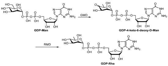D-Rha is a rare 6-deoxy monosaccharide found in the LPS of pathogenic bacteria [54]. GDP-Rha is the precursor for the biosynthesis of D-Rha-containing compounds, and it is synthesized in two steps: (1) GDP-mannose-4,6-dehydratase (GMD) catalyzes the conversion of GDP-D-mannose (GDP-Man) to GDP-4-keto-6-deoxy-D-Man; (2) GDP-6-deoxy-D-lyxo-hexos-4-ulose-4-reductase (RMD) catalyzes the production of GDP-Rha (Figure 7). Both GMD and RMD are members of the short-chain dehydrogenase/reductase (SDR) family. GMD is homologous to RmlB, while RMD is homologous to RmlD. However, GMD and RMD cannot catalyze the conversion of dT4k6dG to dTDP-Rha, indicating that enzymes involved in the GDP-D-Rha biosynthesis pathway possess strict substrate specificity. The functions of GMD and RMD from Aneurinibacillus thermoaerophilus strain L420-91 (T) [55] and Pseudomonas aeruginosa [56] have been confirmed in vitro.