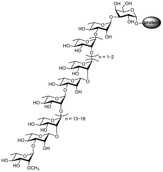 The S-layer protein of Geobacillus stearothermophilus NRS 2004/3a serves as a model for investigating O-glycosylation pathways in bacteria, and the glycans of this protein are 2-OMe-α-L-Rha-(1→3)-β-L-Rha-(1→2)-α-L-Rha-(1→[2)-α-L-Rha-(1→3)-β-L-Rha-(1→2)-α-L-Rha-(1→]n=13–18[2)-α-L-Rha-(1→]n=1–23)-α-L-Rha-(1→3)-β-D-Gal-(1→Protein (Figure 9) [69,70].