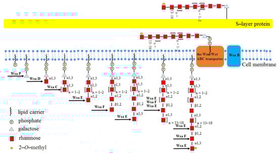 The polycistronic S-layer glycosylation (slg) gene cluster encodes four GTs, of which three Rha-Ts (WsaC, WsaD and WsaF) catalyze the biosynthesis of the glycan [70]. The biosynthesis pathway for this glycan is initiated by the transfer of a galactose residue to a membrane-associated lipid carrier, followed by two steps catalyzed by α-1,3-Rha-Ts (WsaC and WsaD) that add Rha to build up the [2)-α-L-Rha-(1→]n=1–23)-α-L-Rha-(1→3) linker, and two Rha-Ts (WsaE and WsaF) then extend the glycan chain by adding the repeating trisaccharide motif [→2)-α-L-Rha-(1→3)-β-L-Rha-(1→2)-α-L-Rha-(1→]n=13–18 through addition of Rha. The complete glycan chain is thereafter transported across the membrane by an ATP-binding cassette transporter (ABC transporter) and transferred to the S-layer protein by oligosaccharyltransferase WsaB [70]. The functions of WsaC−WsaF were proved by using the chemically synthesized β-D-Gal-(1→O)-octyl as substrate. Among them, both WsaC and WsaD are transmembrane proteins, and the activity of WsaC requires membranes, while WsaD can only recognize the natural substrate; WsaE is a multifunctional enzyme, and the N-terminal domain of WsaE possesses methylase activity, whereas the central and C-terminal domains of WsaE possess Rha-Ts activity, generating α-1,2 and α-1,3 linkages; WsaF is a β-1,2-Rha-T enzyme (Figure 10) [70].