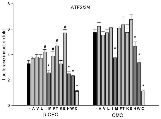 - Averous, J.; Bruhat, A.; Jousse, C.; Carraro, V.; Thiel, G.; Fafournoux, P. Induction of CHOP expression by amino acid limitation requires both ATF4 expression and ATF2 phosphorylation. J. Biol. Chem. 2004, 279, 5288–5297. [Google Scholar] [CrossRef] [PubMed]