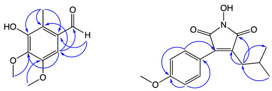Compound 5 was determined to have the molecular formula of C15H17NO4 with eight degrees of unsaturation according to its HRESIMS peak at m/z 298.1051 [M + Na]+. The IR spectrum showed peaks at 3312 (N-OH), 1776 and 1709 (imide), and 1607 and 1514 (aromatic) cm−1. The 1H NMR data showed the presence of a para-substituted aromatic ring (δH 7.47 (d, J = 8.6 Hz, 2H) and 6.92 (d, J = 8.6 Hz, 2H)), a hydroxy group (δH 5.55, s, 1H), a methoxy group (δH 4.00, s, 3H), and an isobutyl group (δH 2.51 (d, J = 7.4 Hz, 2H), 2.05 (m, 1H), and 0.90 (d, J = 6.7 Hz, 6H)). The COSY correlations between H-2′ and H-1′ and two methyl groups further confirmed the presence of the isobutyl group. The 13C NMR data revealed the presence of two carbonyl carbons (δC 167.8 and 167.1) and two quaternary olefinic carbons (δC 136.3 and 135.9), which was characteristic of a maleimide moiety. The relative connectivity was further deduced from the HMBC correlations from H-1′ (δH 2.51) to C-2 (δC 167.8) and C-3 (δC 136.3), and the HMBC correlations (Figure 3) from H-2′′ (δH 7.47) to C-4 (δC 135.9) and C-4′′ (δC 157.4). The overall spectroscopic data of compound 5 were similar to those of antrocinnamomin B [32]. The only difference is the presence of a methoxy group (δC/δH 65.9/4.00) in compound 5 instead of a hydroxy group in antrocinnamomin B. Thus, compound 5 was identified as 3-isobutyl-4-(4-methoxyphenyl)-1H-pyrrol-1-ol-2,5-dione.