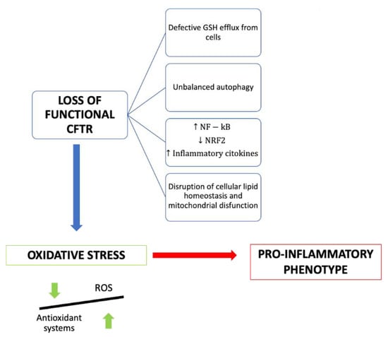 One of the main determinants of progressive lung damage in CF is represented by chronic oxidative stress, which leads to the establishment of an intrinsically proinflammatory environment. The mechanisms behind this are still partially unknown, but several studies have shown the direct implication of CFTR protein dysfunction, mainly in the lungs, but also in extrapulmonary tissues such as the pancreas and intestine [20].