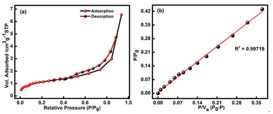 The surface area of the CQDs is examined using N2 physio-sorption analysis in liquid nitrogen at 77 K, as presented in Figure 1a,b. The obtained adsorption-desorption isotherm of the formed CQDs is classified as a type IV isotherm with a hysteresis loop. For the examination, the saturated vapor pressure and adsorption temperature were set up at 100.95 kPa and 77 k. The surface area of the RS@CDs was determined to be 3.95 m2/g, as estimated in the BET plot (Figure 1b). Moreover, the respective linear fit curves displayed the mean pore diameter in the range of 10.23 nm. The pore size volume and micropore volume of the formed CQDs were found to be 0.01012 cm3/g and 0.9088 cm3/g, as estimated through the BET plot illustrated in Figure 1b. The respective outcomes have confirmed that the mesoporous nature of the developed particles can further be useful in detecting harmful pollutants to a large extent.