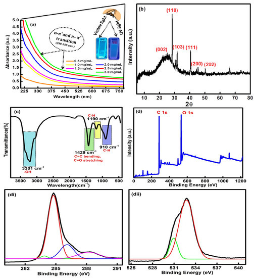 (a) Concentration-dependent UV-vis absorbance, (b) XRD, (c) FTIR and (d–dii) XPS survey scan of CQDs.