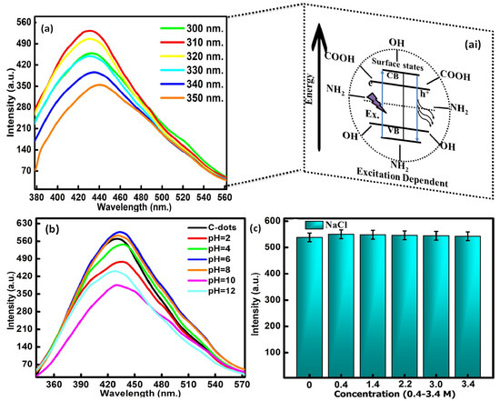 (a) Fluorescence emission spectra at different excitation wavelengths, (ai) mechanistic behavior of emission profile CQDs, (b) pH-dependent emission profile and (c) effect of ionic strength on the emission intensity of CQDs.