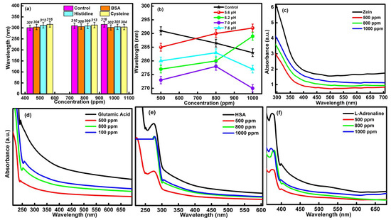 The prime requisite condition before executing the practical and in vivo application of formed CQDs is to evaluate their in vitro and colloidal stability with essential blood protein components. The respective study was performed by determining the absorption efficiency of the different types of blood components (BSA, HSA, cysteine, histidine, L-adrenaline, zein and glutamic acid) in the presence of different concentrations of CQDs (i.e., 1000 ppm, 800 ppm and 500 ppm). The corresponding effect of different pH conditions on the various biological components has also been tested for the developed CQDs. Upon interpreting the data, it was found that the high concentrations of CQDs have not produced any kind of visual or aggregation changes in the chosen blood components and supported the in vitro stability of particles in biological media. It was also observed that the wavelength of CQDs was only shifted in the permissible range of 14 nm in the presence of different blood components, which further confirmed the in vitro stability of CQDs (Figure 5a). The outcomes have further been compared with the buffer solutions of different pH values ranging from 5.6 to 7.6, (Figure 5b). The observed changes in the absorbance values were quite comparable with the earlier results. In addition, the slight hypochromic and bathochromic shift in the data is mainly attributed to the bio-compatible nature of the developed CQDs.