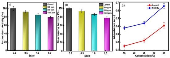 The antioxidant assay receives significant attention among researchers in the field of environmental and biological science. The basis of antioxidant activity deals with the reduced ability of free radical species in the presence of external moieties. The production of oxidative stress has further led to the generation of free radical species, which further inhibited the actions of DNA, proteins and lipids and is responsible for various types of disorders in living beings. However, the presence of antioxidant agents has produced a protective shield against the detrimental effect of free radical components in dose-dependent systems. Therefore, the efficiency of CQDs produced as an antioxidant agent has been tested as a function of concentrations ranging from 1000 to 500 ppm. The visual inspection of the solution in the presence of different concentrations of CQDs has shown the conversion of the transparent solution to a light greenish-blue color. This variation is mainly associated with the antioxidant nature of the formed particles. However, increasing the concentration of CQDs from 500 ppm to 1000 ppm has further reduced the antioxidant capacity of the chosen particles. However, the maximum antioxidant potential has been observed at 500 ppm of the CQDs (Figure 6a). This good performance is primarily explained by the presence of stable surface functional groups such as hydroxyl and carboxyl on the facade of the synthesized CQDs, which further helps to achieve the high anti-oxidant ability in formed particles.