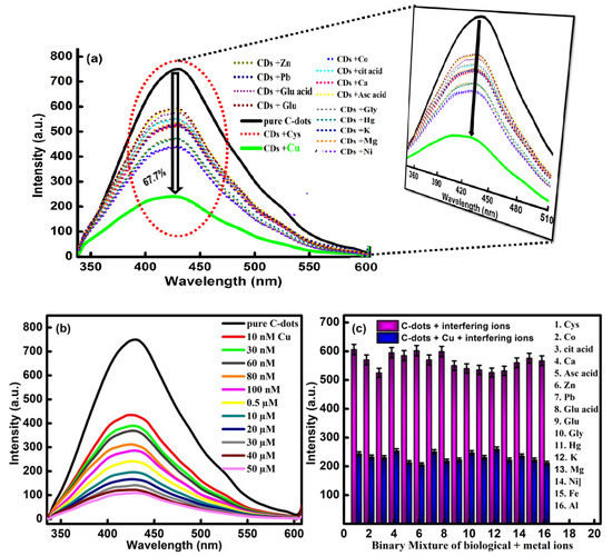 The well-defined emission properties of CQDs were checked against various types of metal ions to enhance their scope in order to develop an easy-to-sense platform without any catalytic-mediated process. For the analysis, the changes in the fluorescence behavior of the developed CQDs have been compared in the presence of 15 different types of biomolecules and metal ions including Ca2+, Hg2+, K+, Mg2+, Cu2+, Ni2+, Pb2+, Co2+, Zn2+, glutathione, ascorbic acid, glutamic acid, citric acid, glycine and cysteine (Figure 7a). Upon comparing the data, it has been observed that the fluorescence intensity of the CQDs have generated small variations in the emission intensity. However, the presence of Cu2+ has produced maximum quenching in the emission intensity of CQDs. Therefore, the developed particles are found to be selective for Cu2+ ions. The quenching in the fluorescence emission intensity is explained by the presence of different types of functional groups over the surface of the CQDs, which further affected the optoelectronic properties via the non-radiative electron transfer mechanism. The turn-off fluorescence signal of the CQDs in the presence of Cu2+ ions is further explained by the splitting of the d-orbital of Cu2+ during the complex formation with the carboxyl and hydroxyl groups of the CQDs and Cu2+ [44]. As a result, electrons present in the excited state of the CQDs are transferred to the d-orbital of Cu2+. Additionally, the paramagnetic nature of the Cu2+ ion leads to the restraining of the transition of the electrons in the form of radiation emission, which further results in the fluorescence turn-off [45].