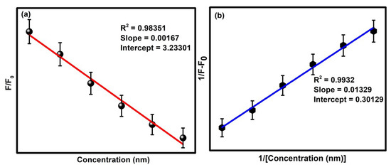 where SD indicates the standard deviation, and P is the slope of the Stern–Volmer plot (Figure 8a). Moreover, the binding efficiency of the developed sensory probe was estimated from the Benesi–Hildebrand plot (Figure 8b). The obtained values of the detection limit, binding constant, quantization constant and fluorescence quenching factor have been given in Table 1. The limit of detection of the sensor was calculated to be 0.31 nm.