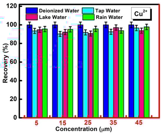 The practical utility of the developed nanoprobe was further accessed in real water samples taken from drinkable tap water, rainwater, lake water and deionized water. For the analysis, the synthesized CQDs were added to the different concentrations of Cu2+ (5 μm to 45 µm) in the chosen water samples, and their fluorescence intensity was measured via exciting the sample at a wavelength of 310 nm. The outcomes have confirmed the significant quenching in the presence of different concentrations of Cu2+ in each real water sample, which reflects the scope of application of the developed chemosensor for practical purposes. The recovery values were found to be in the range of 91–97% (Figure 9). The respective results have also displayed the feasibility of the synthesized CQDs for the practical detection of Cu2+ ions with a high sensitivity and specificity in different sources of water media. Moreover, the developed sensing strategy possessed a facile working principle in an economical manner. The upcycling of waste rice straw for the affordable synthesis of CQDs has enabled the green approach for the reproducible and precise determination of Cu2+ in real water sources.