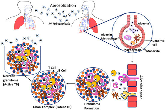 Tuberculosis is caused by Mycobacterium tuberculosis (Mtb), a Gram-negative, rod-shaped bacteria belonging to the family Mycobacteriaceae. Even though Mtb can infect other mammalian species, humans are their significant reservoir [19,20]. Tuberculosis infections arise when the bacterial growth spread into the air by infected patients coughing, sneezing, or close contact; these aerosol droplets enter the host’s alveoli via inhalation. This leads to the activation of the host’s innate immune system, resulting in Mtb phagocytosis by alveolar macrophages [21]. If the Mtb gets beyond the first line of defense, they start multiplying inside the macrophages and spread to the surrounding cells, including epithelial and endothelial cells, and reach their exponential growth phase in a few weeks [22]. Additionally, Mtb can also spread to other organs via the circulation or lymphatic system during the initial stage of illness [23].