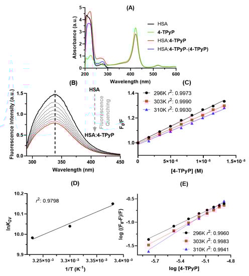 To obtain quantitative parameters on the binding capacity of HSA:4-TPyP, the maximum fluorescence data after inner filter correction were treated by Stern–Volmer (Equation (2)), double-logarithmic (Equation (3)), van’t Hoff (Equation (4)), and Gibbs’ free energy (Equation (5)) approximations [15,45,46,47].