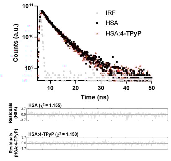 To further confirm the main fluorescence quenching mechanism detected by both UV-vis analysis and Stern–Volmer approximation, time-resolved fluorescence decays were obtained without and with the maximum porphyrin concentration used in the UV-vis absorption and steady-state fluorescence (Figure 3). The HSA decay without porphyrin showed two fluorescence lifetimes: τ1 = 1.67 ± 0.13 and τ2 = 5.67 ± 0.11 ns, with relative percentage of 22.7% and 77.3%, respectively, agreeing with the literature [18,19], while the complex HSA:4-TPyP showed τ1 = 1.80 ± 0.19 and τ2 = 5.52 ± 0.13, with a relative percentage of 19.7% and 80.3%, respectively. Amiri and coworkers [20] observed that the fluorescence decay for emissive amino acid Trp in HSA yields three lifetimes. The first two lifetimes are already observed for free-Trp (attributed to excited-state Trp substructures) and the third, longer one, results from interactions between the Trp residue and its microenvironment in the protein matrix. The first lifetime is short (sub nanosecond) with a low pre-exponential factor (3%). Thus, due to the instrumental limitations, most reports (as we in the present work) observe solely two lifetimes. Values of the two fluorescence lifetimes and of their pre-exponentials (this is, the relative population of the Trp excited states which are the origin of the fluorescence) may depend on the microenvironment and on the extension and nature of interactions formed upon HAS: ligand complex formation. The measured lifetimes values and the respective percentages do not vary significantly with the formation of the complex, evidence that the microenvironment around the fluorophore is not perturbed very much with the presence of 4-TPyP.