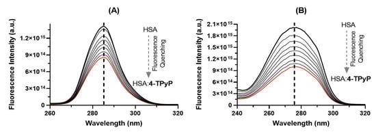 Comparing the steady-state fluorescence technique with the synchronous fluorescence (SF), the last one has been considered a complementary and more sensitive approach to detect possible perturbations in the microenvironment around the two main fluorophores of albumin (Tyr and Trp residues) after drug binding [25,26,27]. Figure 4 shows the SF spectra for HSA without and upon successive additions of 4-TPyP at Δλ 15 and 60 nm for Tyr and Trp residues, respectively. For both Δλ, there is a significant decrease in the fluorescence signal upon additions of porphyrin, however, it did not induce any blue- or red-shift, agreeing with steady-state fluorescence data (Figure 2B), which indicated that the binding of 4-TPyP does not induce any significant perturbation on the microenvironment around the fluorophores.