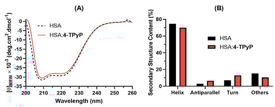 Circular dichroism (CD) plays an essential role in studying perturbation on the secondary structure of albumin upon drug binding [28,29]. Figure 5A depicts the CD spectra for HSA without and with 4-TPyP, while Figure 5B shows the corresponding secondary structure content. The CD spectra of HSA and HSA:4-TPyP are practically similar in shape and peak position: two minimum peaks, one at 208 nm and the other at 222 nm. Additionally, the secondary structure content did not differ significantly even upon the addition of 4-TPyP in a proportion HSA:4-TPyP of almost 1:13.