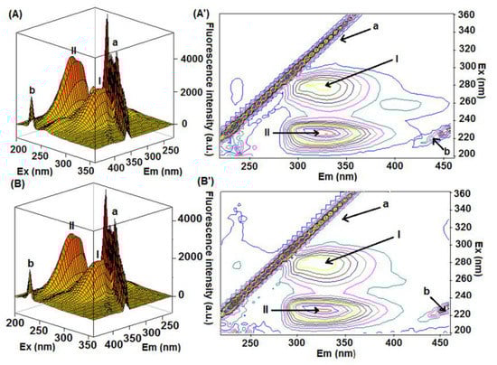 The 3D-fluorescence spectra and the corresponding contour maps for (A,A’) HSA and (B,B’) HSA:4-TPyP in pH = 7.4 at room temperature. [HSA] = 1.0 × 10−6 M and [4-TPyP] = 1.32 × 10−6 M.