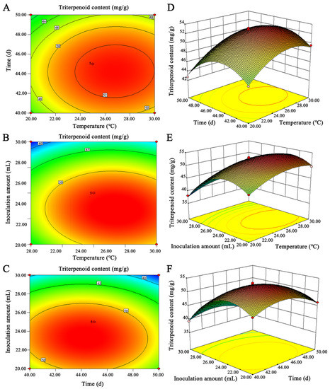 Response surface and contour map of the influence of the interaction of various factors on the content of triterpenoids. (A–C) Two-factor interactive contour maps and (D–F) two-factor interactive 3D maps.