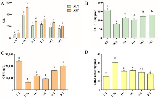 Effect of the ethanol extract of G42 on serum marker enzymes and oxidative stress level in the liver of acute liver injury caused by CCl4. (A) ALT and AST and (B) SOD level. (C) GSH and (D) MDA. The results are shown as mean ± SD. Different letters above each bar in the same parameter indicate a significant difference (p < 0.05) (n = 5).