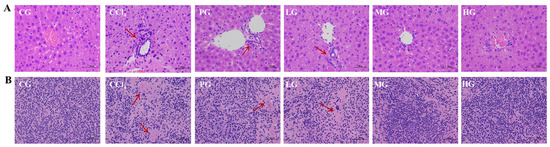 The cell nuclei from livers (Figure 3A) and kidneys (Figure 3B) in the CCl4 group were absent and disordered, with poor intercellular boundaries and extensive cell necrosis (red arrows indicate areas of extensive necrosis) compared with those in the CG group. The PG showed a decrease in the number of necrotic tissue cells and an increase in the number of cells with intact nuclei, although nuclear cohesion was still observed. The LG, MG, and HG showed a gradual decrease in the area of necrotic cells with increasing dose concentrations, and the HG sharply reduced the number of necrotic cells and recovered liver tissue histology and renal histology.