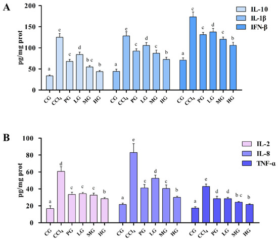 Inflammatory cytokines are involved in the inflammatory response and can respond to cell and tissue damage. The recovery of injured cells and tissues was evaluated by measuring the levels of inflammatory cytokines in liver-injured mice (Figure 4). Compared with the GC, the levels of IL-2, IL-8, IL-10, TNF-α, IFN-β, and IL-1β of liver tissue in the CCl4 group were significantly increased (p < 0.05), and the administration group decreased the level of all inflammatory factors in cells, the HG group had the most significant inhibitory the level of inflammatory factors. The IL-10, IFN-β, and IL-1β levels showed a clear dose-dependent effect (Figure 4A), while the IL-2 and TNF-α levels (Figure 4B) were not significantly changed.