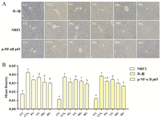 (A) Immunohistochemical results of hepatic IL-Iβ, NRF2, p-NF-κB p65 in acute liver injury mice (magnification 200×); (B) Quantitative analysis results, the same letter indicates no significant difference between groups (p > 0.05); the different letters indicate significant difference between groups (p < 0.05).