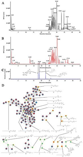 The differential chemical components were identified by constructing MS/MS molecular networking and UNIFI 1.9 (Waters, USA). The MS/MS molecular network was generated using the GNPS platform. The MSE data were first converted to a CSV file and an MSP file using Progenesis QI [39] and then uploaded to GNPS to create the molecular networks. The precursor ion mass tolerance was set to 0.5 Da and the production tolerance to 0.1 Da. A network was constructed using three minimum matched peaks and a cosine score above 0.7. The spectra in the network were searched against the spectral libraries on GNPS to identify the components. Results were open and visualized using the Cytoscape 3.7.2.