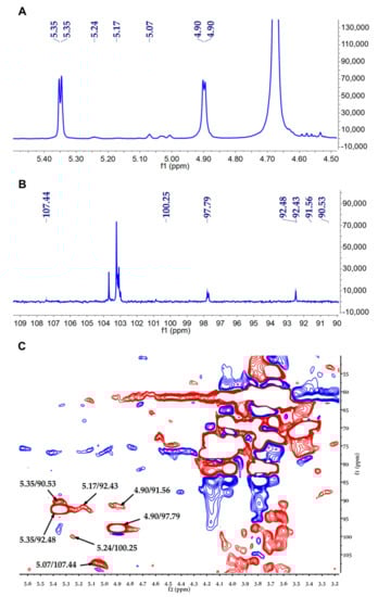 NMR spectra of CPP−1. (A) 1H NMR spectrum; (B) 13C NMR spectrum; (C) HSQC spectrum; red is a positive signal and blue is a negative signal.