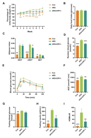 CPP−1 reduced HFD-induces body weight gain and improved glucose metabolism in mice. (A) Percentage of initial body weight; (B) daily food intake; (C) adipose index (adipose weight/body weight); (D) random blood glucose; (E) glucose tolerance test (GTT); (F) the areas under the curve (AUC); (G) fasting blood glucose; (H) fasting insulin; (I) insulin resistance index (HOMA-IR). Data are expressed as the mean ± SEM. Graph bars marked with different quantity of star sign on top represent statistically significant results based on two-tailed Student’s t-tests (* p < 0.05, ** p < 0.01, *** p < 0.001 versus HFD).