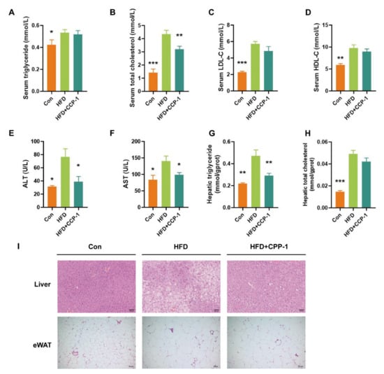 After 16 weeks of HFD treatment, the triglyceride (TG), total cholesterol (T-CHO), low-density lipoprotein cholesterol (LDL-C), high-density lipoprotein cholesterol (HDL-C), alanine aminotransferase (ALT), aspartate aminotransferase (AST) levels in the serum and the triglyceride, total cholesterol levels in the liver were significantly stimulated by HFD feeding (Figure 4A–H). CPP−1 treatment reversed the HFD-induced elevation of serum total cholesterol (Figure 4B), ALT (Figure 4E), AST (Figure 4F), and hepatic triglyceride (Figure 4G). These results suggested the lipid metabolism improvement effect of CPP−1.