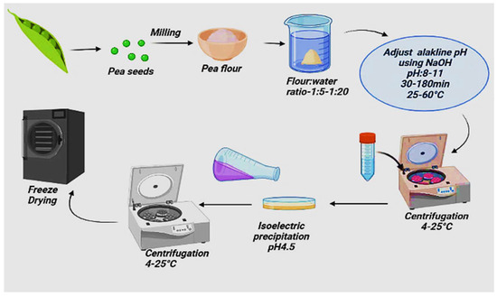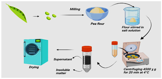 Pea protein is available in different forms, including pea flour, pea protein concentrates, and pea protein isolate. Mainly pea protein is utilized in the form of concentrate and can be produced through an acid hydrolysis process [24,25]. Pea protein extraction requires selecting appropriate treatments to maximize yields and estimate functional, nutritional, and structural properties that affect their applicability in the food industry [26,27]. In addition, several extraction techniques, including wet extraction, dry fractionation, salt extraction, micellization, and mild fractionation, are used to obtain pea protein concentrates and isolates [28]. Prior to protein extraction, pea seeds undergo pre-treatment steps such as cleaning, drying, sorting, dehulling, and splitting that allow the detachment of the hulls and the cotyledons from whole pulses; therefore, it facilitates protein extraction without affecting their techno-functional properties [29]. The extraction method, pH, duration of solubilization, number of washes, ionic strength, solvation ratio, temperature, extraction equipment, and filtration or purification techniques are some factors that influence the efficiency of the extraction as well as the protein isolate characteristics [30].