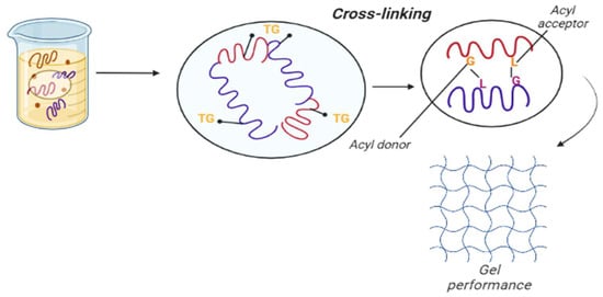 An enzymatically modified approach is considered to be cleaner and more efficient than physical and chemical modification (Figure 6 and Table 4). Another advantage of enzymatic modification over chemical approaches is enzymes’ fast reaction time and specificity [120]. This type of protein modification is classified into enzymatic hydrolysis and crosslinking methods. Enzymatic modification is an alternative method for improving the emulsification characteristics of pea protein by the breakdown of protein structure. Microbial transglutaminase (MTG) is an enzyme commonly used to cross-link protein. It is isolated from specific bacteria such as Streptoverticillium mobaraense; the latter can be achieved by the enzymatic formation of covalent bonds using transglutaminase and laccase by catalyzing acyl transfer reaction between a γ-carboxamide group of protein-bound glutamine and lysine, thereby affecting gel performance of protein [72]. During microbial transglutaminase treatment, pea protein’s albumin and globulin fractions show a different behavior, and the albumin fraction is not good for gelation. The changes in structure and conformation of proteins are responsible for improving techno-functionality [121].