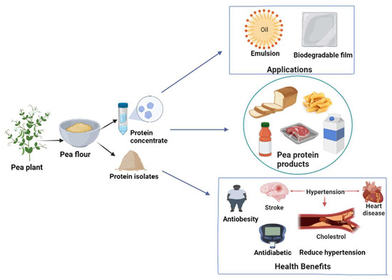 The different applications of pea protein in food-related products include encapsulation for bioactive ingredients, extruded foods, and edible films. They are generally used as a substitution for cereal flours, fats, and animal proteins [17,18,19,20]. Pea protein’s functional properties and its fractions’ ability to form soft gels help develop and produce dairy analog drinks, fermented products, and curd. Solubility is an important property for functional ingredients in high moisture foods, such as emulsions, foams, and beverages [21]. Other properties like surface-active and structure-forming make them suitable for forming encapsulation and delivery systems [22]. As an industrial application, it can be used for pest control as an insecticidal protein proteinaceous cysteine proteinase inhibitor (CPI) found in pea [23]. Therefore, the main objective of the present work is to highlight the current status and industrial food application of pea protein. This review provides outlooks on the functional attributes of pea protein isolates, including protein structure, extraction methods, and physicochemical properties. The application of pea protein in food products and its effects on the health of the human body are also evaluated.